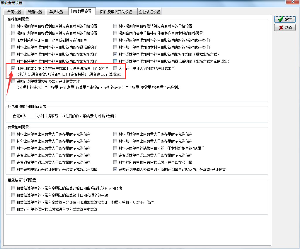 設備成本計算方法(二) 在工程項目管理軟件【系統(tǒng)維護】-【系統(tǒng)全局設置】-【價格數(shù)量設置中】有設備計算成本方式的控制開關,如下圖: