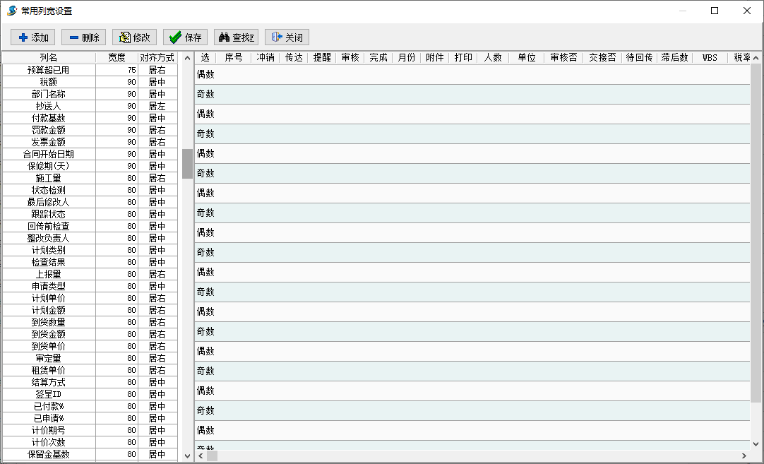 六、常用列寬設(shè)置 - 對列表或查詢表格中不同字段的列寬做單獨(dú)設(shè)置,分字段名、寬度和對齊方式3種設(shè)置,字段名必須與列表或查詢表格中的字段名一致,否則無法生效;寬度為字段的顯示寬度,原則為恰好或更好顯示當(dāng)前字段內(nèi)容為準(zhǔn);對齊方式分居中、居左和居右3種方式,原則上推薦數(shù)字類居右顯示,其他字段可根據(jù)用戶個體習(xí)慣自行設(shè)置,設(shè)置界面圖如下: