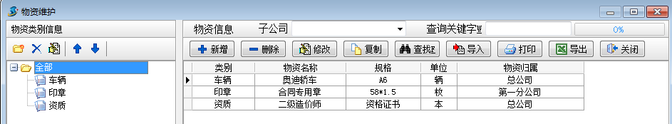 工程項目物資管理可用于管理車輛,印章,證書,資質(zhì),設(shè)備,辦公用品等物資的入庫,報損,借用,歸還等過程。錄入相關(guān)單據(jù)前,需先錄入要用到的基礎(chǔ)信息中的【物資維護(hù)】【子公司信息維護(hù)】。
