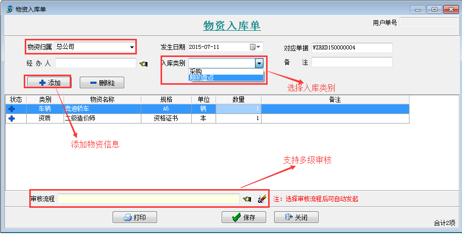 【物資入庫(kù)單】是用來(lái)登記發(fā)生的物資入庫(kù)的單據(jù)。