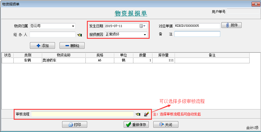 【物資報(bào)損單】是用來報(bào)損物資的業(yè)務(wù)單據(jù)。 類似【材料報(bào)損單】或者【設(shè)備報(bào)損單】,一個(gè)是針對物資報(bào)損,一個(gè)是針對材料或者設(shè)備報(bào)損。