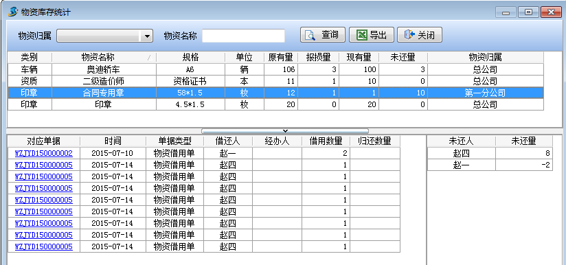 物資庫存統(tǒng)計(jì)可以很方便查詢物資的借還記錄,物資借還人以及物資的未還量。當(dāng)物資借用人想借用物資時(shí),可以先查看物資庫存統(tǒng)計(jì),方便借用物資。