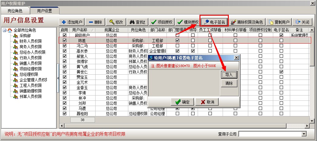 登陸超級用戶,選擇系統(tǒng)維護模塊,打開用戶管理權限設置,選擇需要設置電子簽名的用戶,點上面的電子簽名,對應導入提前設置好的電子簽名圖片(jpg格式)