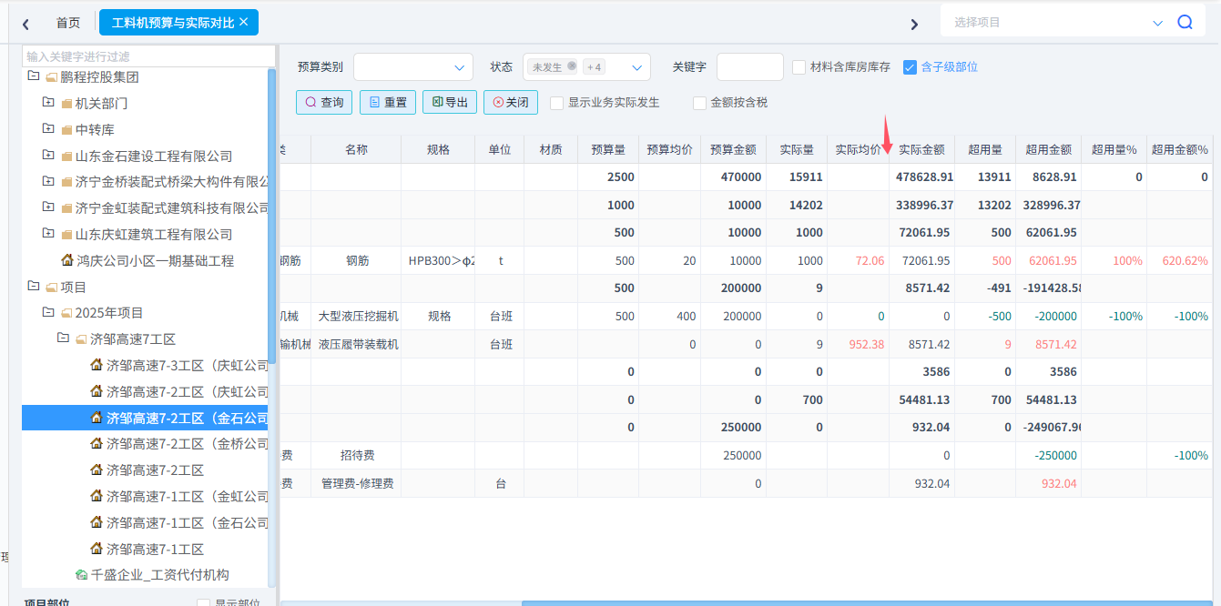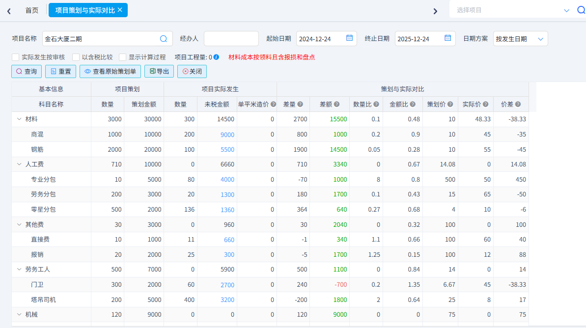可以統(tǒng)計工料機(jī)預(yù)算與實際對比、合同清單與實際發(fā)生對比、分部分項四算對比