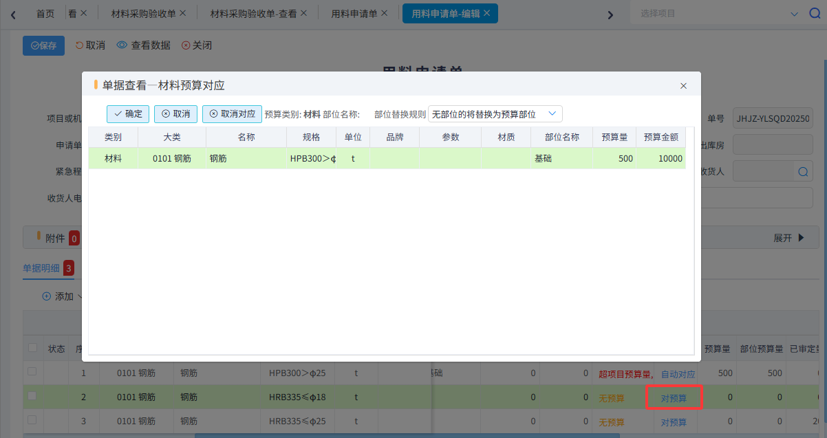 如果單據(jù)填寫時或者以后查詢預(yù)算對比時發(fā)現(xiàn)預(yù)算材料跟實際發(fā)生不一致,可以選擇手動對應(yīng)預(yù)算
