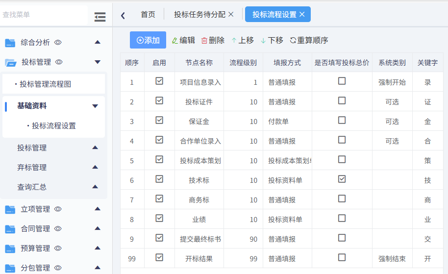 在此界面中的投標(biāo)任務(wù)節(jié)點(diǎn),是在投標(biāo)流程設(shè)置中預(yù)先設(shè)置好的,若與公司現(xiàn)有流程有差異,可自行設(shè)置投標(biāo)流程