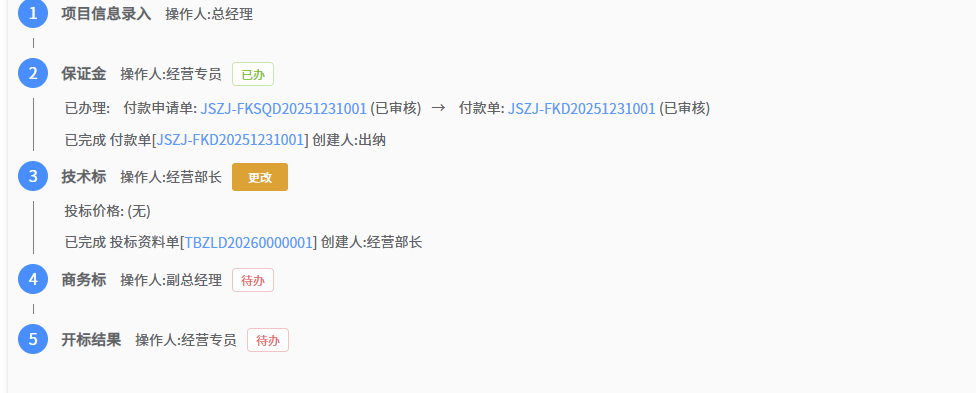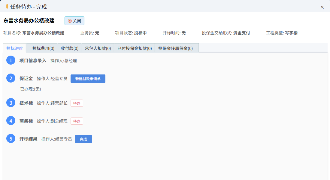 付款申請審核通過后,由財(cái)務(wù)出納做付款單,完成投保金付款的閉環(huán)。在投標(biāo)任務(wù)已辦中,可看到狀態(tài)的變化。如下圖所示