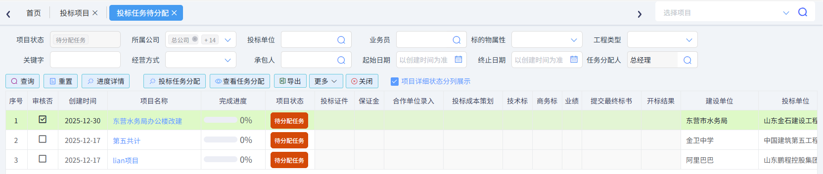 確認(rèn)任務(wù)分配后,相應(yīng)的操作人會收到消息提醒,操作人就可以在投標(biāo)待辦模塊中操作,如下圖所示