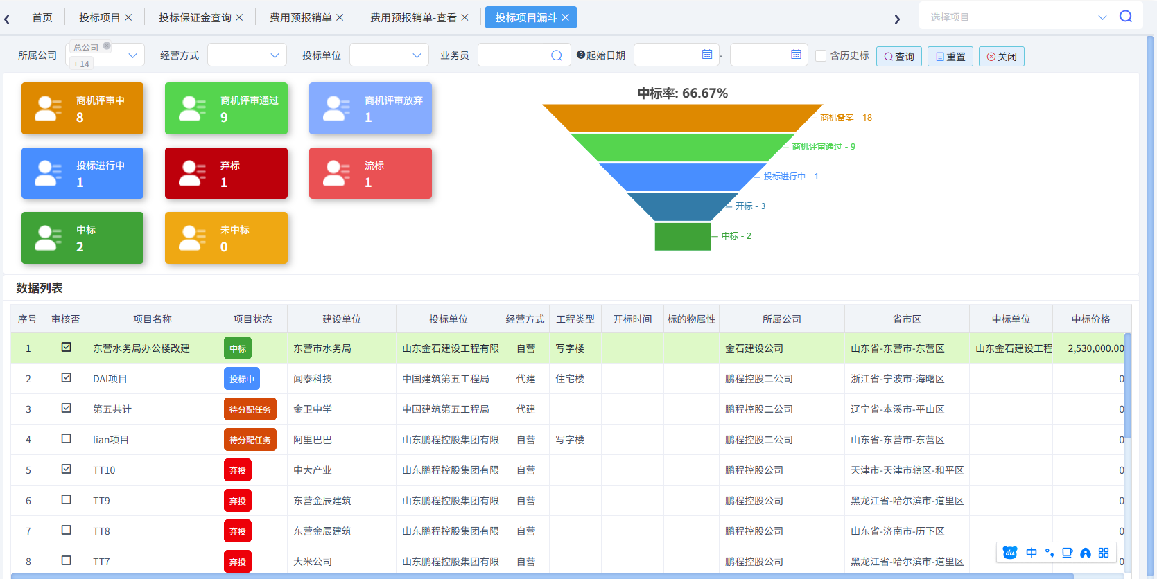 投標(biāo)項(xiàng)目一覽表可以查看投標(biāo)項(xiàng)目狀態(tài)、完成度、投標(biāo)任務(wù)節(jié)點(diǎn)、中標(biāo)單位、中標(biāo)金額等信息,如下圖所示
