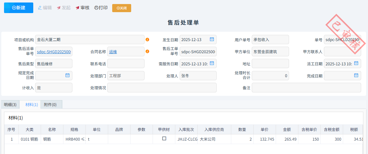 現(xiàn)場技術(shù)人員維修或者安裝完成之后填寫售后處理單。售后處理單可以關(guān)聯(lián)售后派單,自動(dòng)生成需處理明細(xì)。
