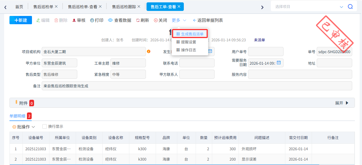 根據(jù)售后工單可以生成售后派單,安排技術(shù)人員去維修