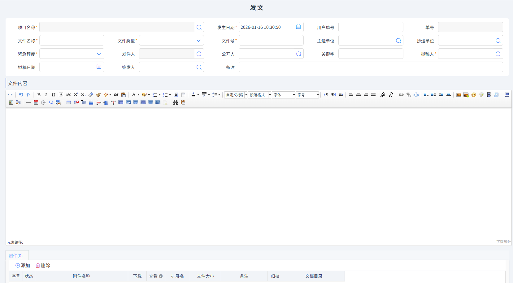 和收文類似,根據(jù)發(fā)文要求填寫文件名稱、文件類型、主送單位、擬稿人等,并附上發(fā)文電子檔,如下圖所示