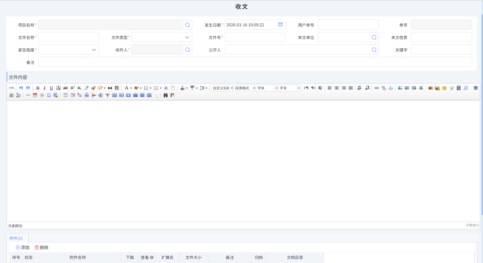 來文后,根據(jù)來文信息,填入收文中,項(xiàng)目名稱、文件名稱、文件類型、來文單位、來文性質(zhì)、收件人、公開人等,特別注意的是下方要附上來文的原始文件電子檔,如下圖所示