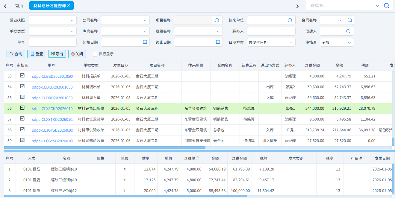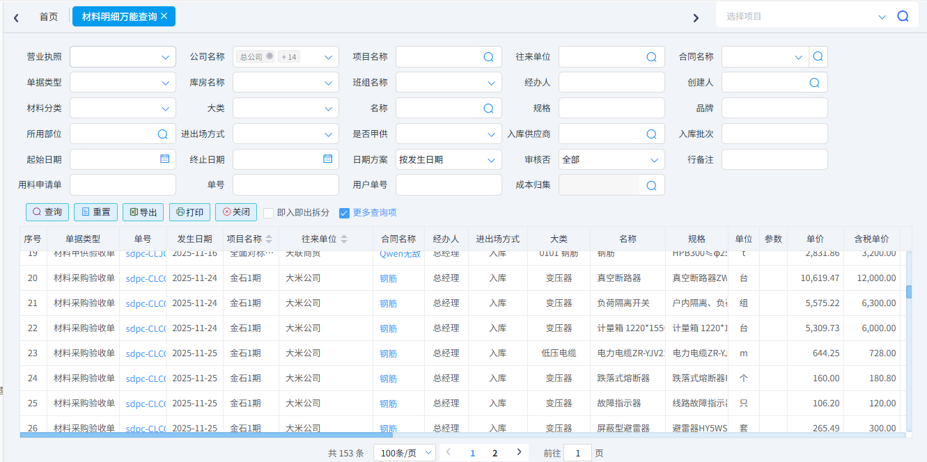查詢所有類型的材料單據(jù)。一般用于材料單據(jù)的對(duì)賬??梢园凑諉螕?jù)類型、項(xiàng)目名稱、供應(yīng)商、材料名稱、時(shí)間等條件進(jìn)行篩選。可以導(dǎo)出excel表格。