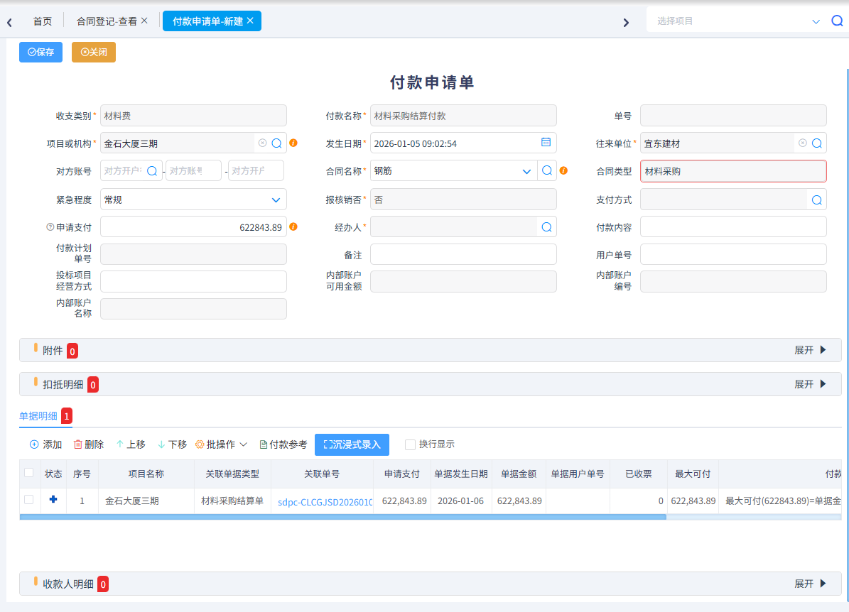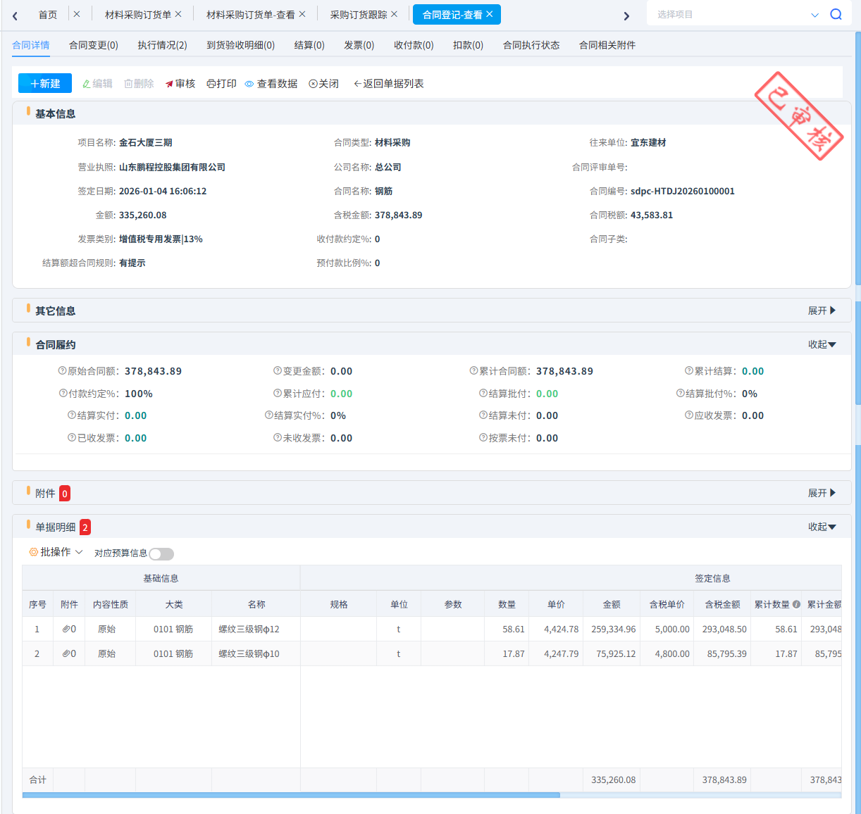 我們以生成合同為例,在合同里可以操作合同變更、材料到貨驗收、材料退貨、材料結(jié)算、合同扣款、合同預(yù)付款、合同結(jié)算付款、合同收進發(fā)票。