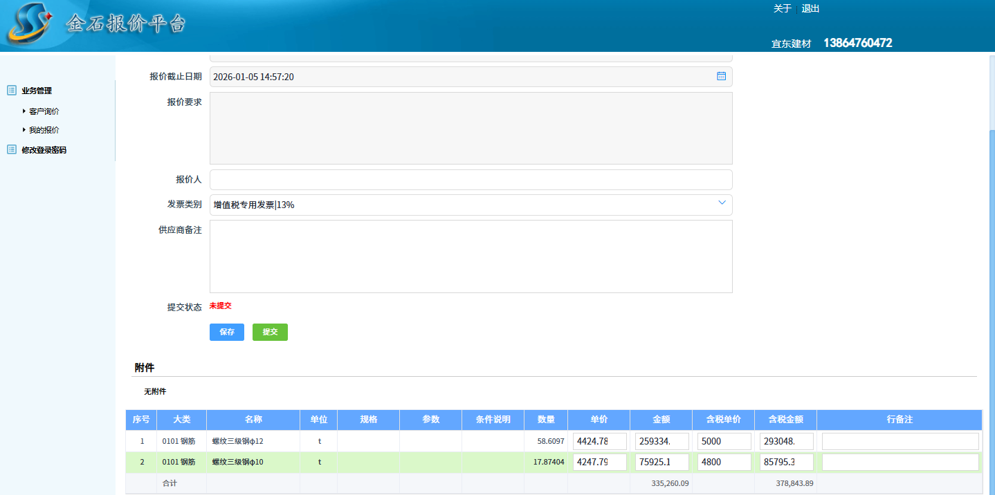 材料詢價單審批完成之后可以自動發(fā)送短信給供應(yīng)商,供應(yīng)商根據(jù)短信提示直接在金石報價平臺進行報價。