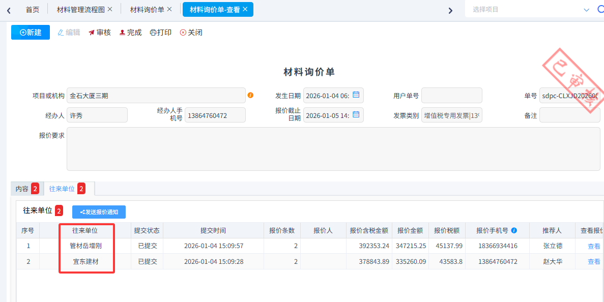 供應(yīng)商提交報價后,會自動發(fā)送短信給公司詢價人,詢價人在系統(tǒng)就可以查看報價并進行比價。