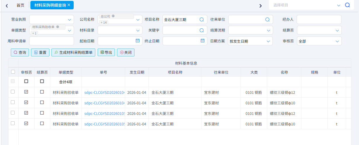 查詢所有類型的材料單據(jù)。一般用于材料單據(jù)的對賬??梢园凑諉螕?jù)類型、項目名稱、供應(yīng)商、材料名稱、時間等條件進行篩選。可以導(dǎo)出excel表格。