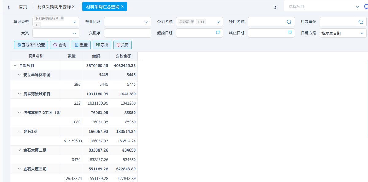 用于查詢公司或者項目材料采購和退貨情況,可以按照公司、項目名稱、供應(yīng)商、材料名稱、發(fā)生日期等條件篩選。