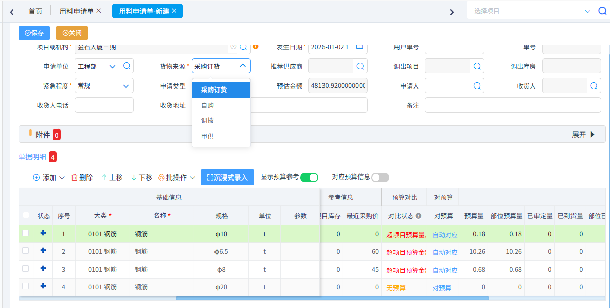首先由項目現(xiàn)場施工員根據(jù)工程進度填寫用料申請。申請材料明細可以從工料機預(yù)算中調(diào)取,超出預(yù)算時系統(tǒng)會進行預(yù)警,當(dāng)購買的材料跟預(yù)算不一致是還可以手動對應(yīng)預(yù)算。在用料申請單還可以選擇貨物來源,選擇采購訂貨、自購、調(diào)撥、甲供。其中選擇采購訂貨可以生成采購訂貨單和采購合同一般用于大宗采購或者集采。選擇自購可以直接生成采購訂貨單,一般用于零星采購或者項目部直接采購。調(diào)撥用于申請項目調(diào)撥材料使用,后續(xù)可以生成材料調(diào)出單。甲供用于申請甲供材料,后續(xù)可以生成材料甲供驗收單。