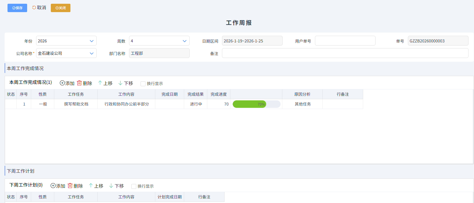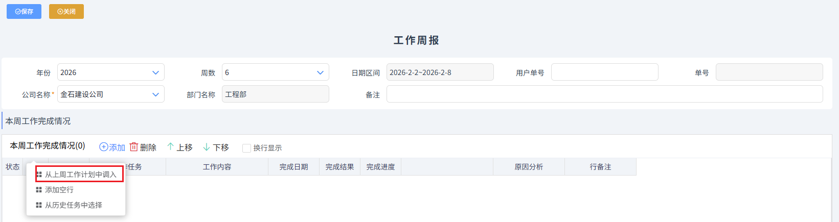 年份默認(rèn)為本年度,周數(shù)會(huì)顯示本年度所有周數(shù),如26年會(huì)顯示1~52周,公司名稱需要手動(dòng)選擇。注意上圖中的工作周報(bào)若本周的工作任務(wù)沒(méi)有完成,那么新的一周的工作周報(bào),可以直接調(diào)取未完成的歷史任務(wù)。如下圖所示: