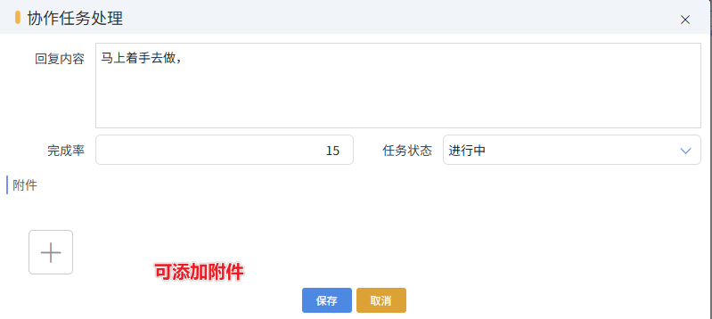 例如,負(fù)責(zé)人點(diǎn)開(kāi)查看任務(wù)后,在協(xié)作任務(wù)處理中,對(duì)當(dāng)前任務(wù)進(jìn)行回復(fù),如下圖所示:
