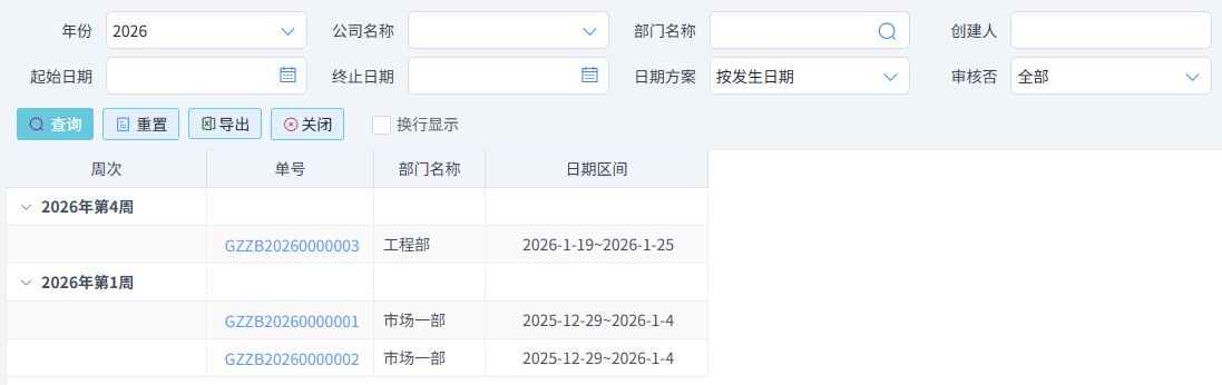 工作周報(bào)一覽可根據(jù)年份、公司名稱、部門(mén)名稱、創(chuàng)建人和日期查詢對(duì)應(yīng)周報(bào),如下圖所示: