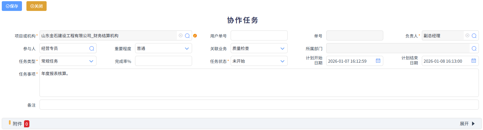 協(xié)作任務(wù)可以是領(lǐng)導(dǎo)下達(dá)任務(wù),需要負(fù)責(zé)或參與人完成,或者發(fā)起人任務(wù)切需要其他人來(lái)協(xié)作完成的單據(jù),如下圖所示,可以體現(xiàn)任務(wù)事項(xiàng)、負(fù)責(zé)人、參與人、關(guān)聯(lián)業(yè)務(wù)、任務(wù)狀態(tài)、計(jì)劃開(kāi)始和結(jié)算日期等,