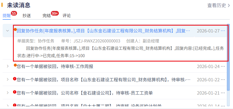 保存后,任務(wù)發(fā)起人會(huì)收到任務(wù)完成的消息提醒。如下圖所示: