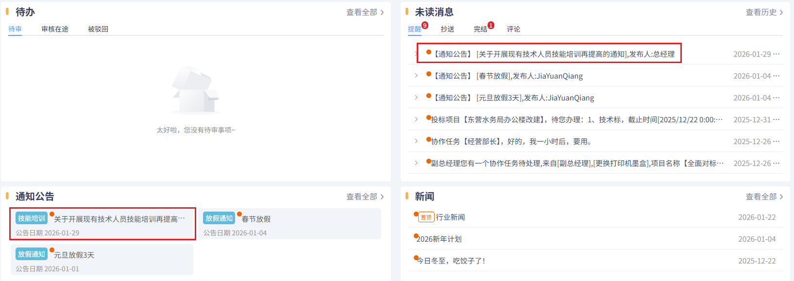 接收人在首頁(yè)的通知公告欄和未讀消息中看到此通知,如下圖所示:
