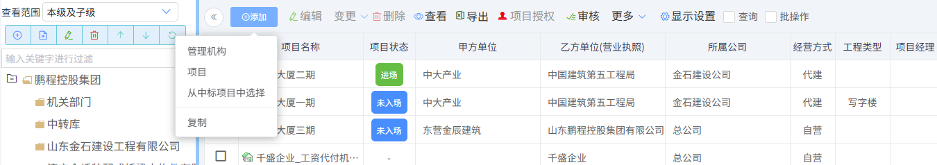 建立項(xiàng)目時(shí),左側(cè)選擇項(xiàng)目節(jié)點(diǎn),然后點(diǎn)擊上方添加按鈕,可以建立管理機(jī)構(gòu),也可以建立項(xiàng)目。如果建立項(xiàng)目,可以手動(dòng)輸入,也可以選從中標(biāo)項(xiàng)目中選擇,如下圖所示: