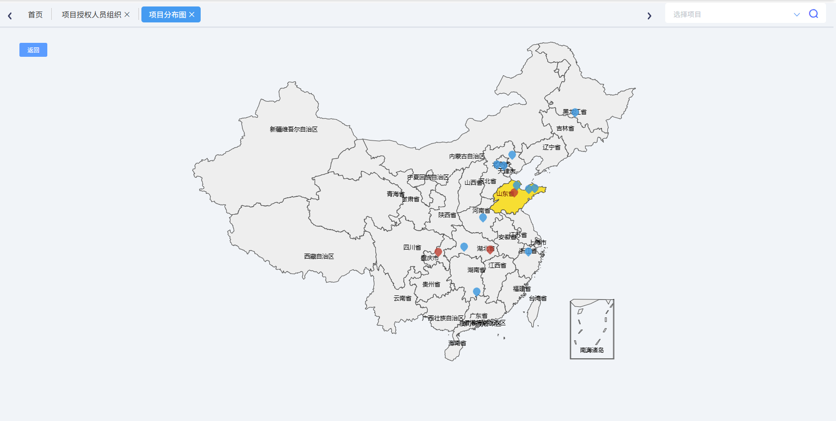 項(xiàng)目立項(xiàng)時(shí)設(shè)定好項(xiàng)目經(jīng)緯度,就可以項(xiàng)目分布圖中展示項(xiàng)目位置坐標(biāo),如下圖所示: