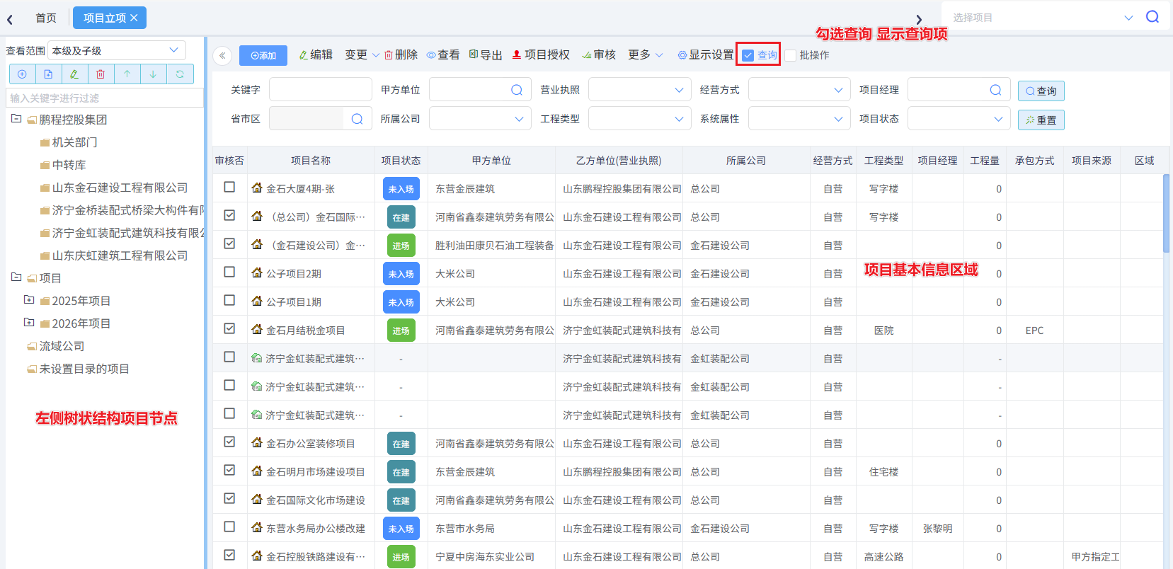 項(xiàng)目立項(xiàng)即生產(chǎn)立項(xiàng),項(xiàng)目中標(biāo)后在此界面建立項(xiàng)目,左側(cè)為樹狀結(jié)構(gòu)項(xiàng)目節(jié)點(diǎn),右側(cè)上方為常用按鈕和查詢區(qū)域,下方為項(xiàng)目的基本信息,如下圖所示: