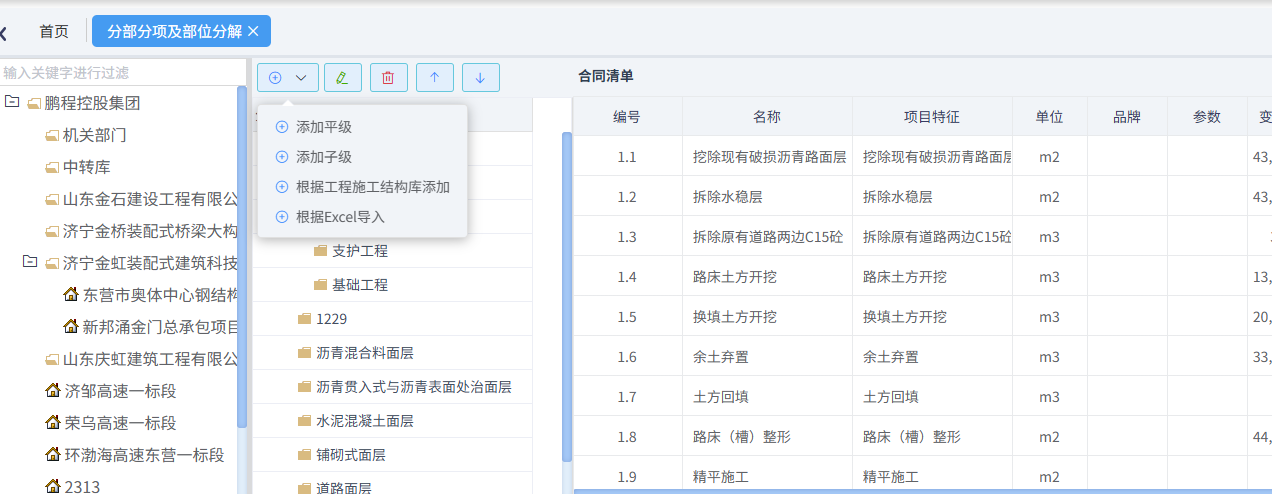 分部分項(xiàng)可以手動(dòng)添加,也可以從結(jié)構(gòu)庫中添加,也可以excel批量導(dǎo)入,如下圖所示: