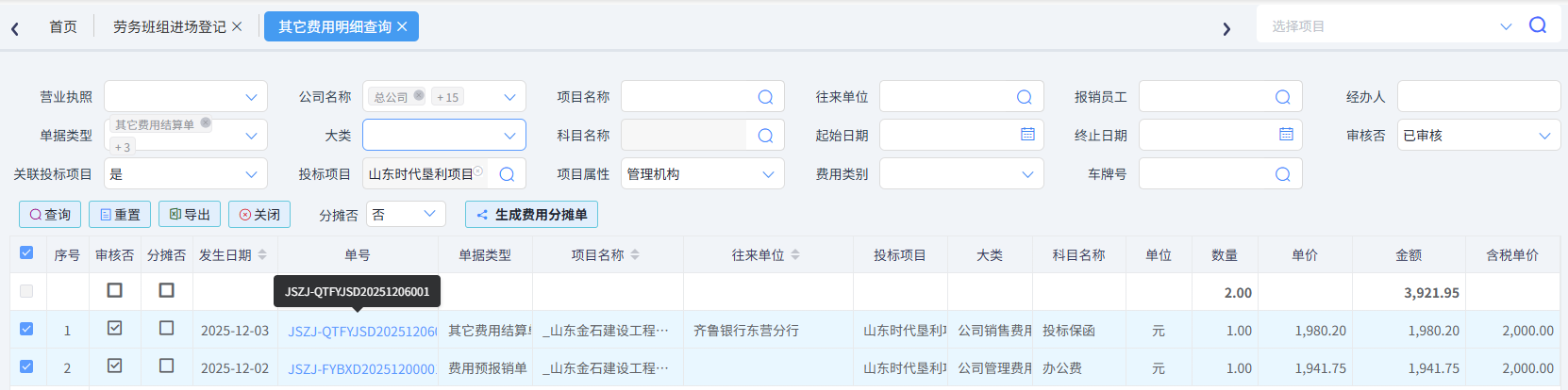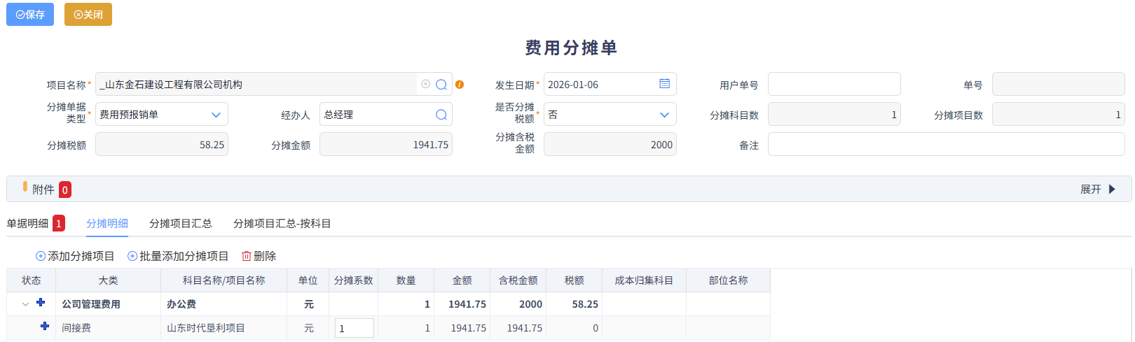 勾選(必須是同單據(jù)類型)后點(diǎn)擊生成費(fèi)用分?jǐn)倖危诜謹(jǐn)偯骷?xì)中,顯示結(jié)轉(zhuǎn)到中標(biāo)項(xiàng)目的費(fèi)用內(nèi)容和金額。如下圖所示: