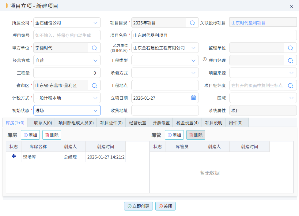 選擇一個(gè)項(xiàng)目中標(biāo)項(xiàng)目,點(diǎn)擊確定后,彈出創(chuàng)建項(xiàng)目窗口,如下圖所示: