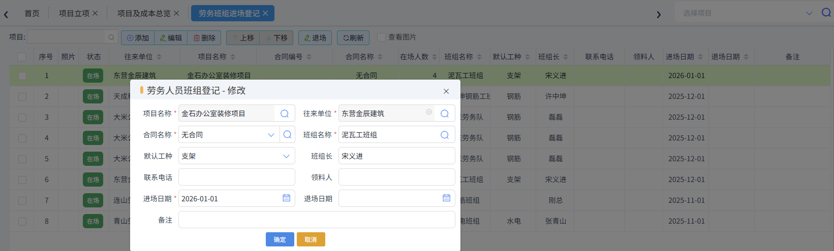 特別注意,只有班組進(jìn)場登記完成后,材料領(lǐng)用和勞務(wù)類等單據(jù)才可以正常填寫。