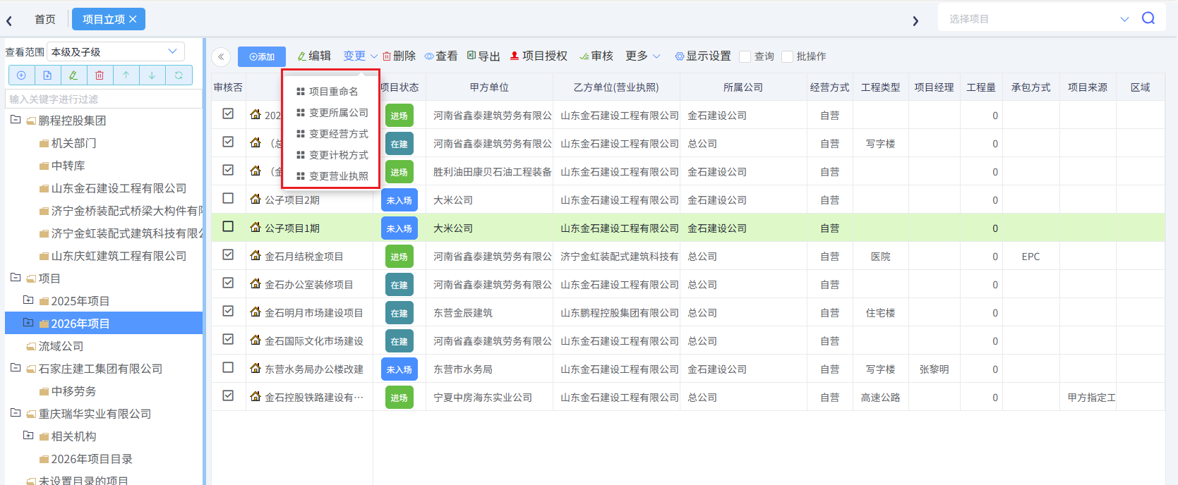 如有項(xiàng)目信息變更,可通過變更按鈕實(shí)現(xiàn),可以重命名、變更所屬公司、經(jīng)營方式等,如下圖所示:
