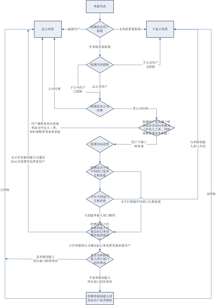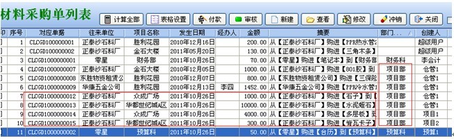 (3)材料采購單、材料銷售單、材料退貨單、外包人工單、外包機械單、運輸車輛單、租賃結(jié)算單、其它費用單、設(shè)備采購單、設(shè)備維修單、設(shè)備退貨單、付款申請單、付款單、收款單 (涉及財務(wù)的這14個單據(jù)) 對于【財務(wù)部】也不受該條件限制,可以查看所有部門單據(jù)。