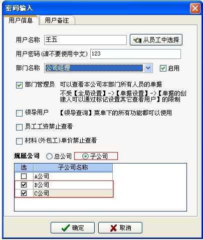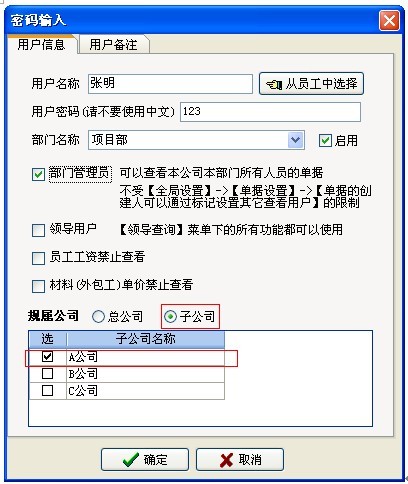 如上圖:王五規(guī)屬于B、C公司,是【公司經(jīng)理】可以看到B、C兩個公司的所有部門、所有授權(quán)項目有關(guān)的業(yè)務(wù)單據(jù)。