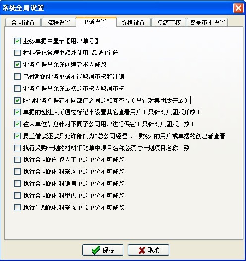 (2)材料采購單、材料銷售單、材料退貨單、外包人工單、外包機械單、運輸車輛單、租賃結(jié)算單、其它費用單、設(shè)備采購單、設(shè)備維修單、設(shè)備退貨單、付款申請單、付款單、收款單 (涉及財務(wù)的這14個單據(jù)) 對于【財務(wù)部】也不受該條件限制,可以查看所有部門單據(jù)。