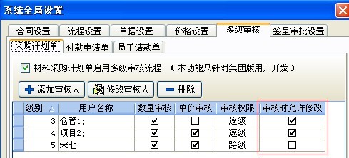(1) 在采購計劃單、付款申請單、員工請款單中的多級審核設(shè)置中,如下圖: