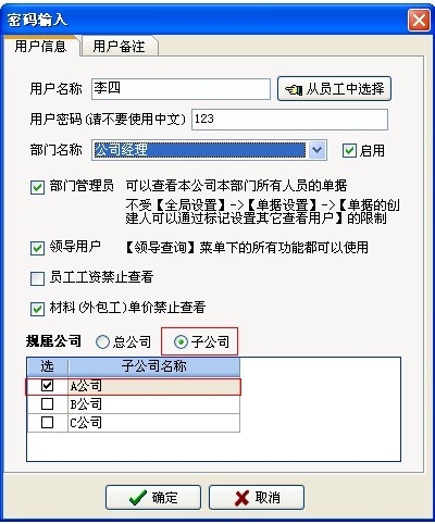 如上圖:李四規(guī)屬于A公司,是【公司經(jīng)理】可以看到A公司的所有部門、所有授權(quán)項目有關(guān)的單據(jù)。