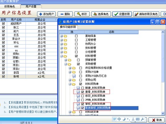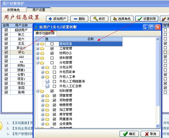 (5)設(shè)置好用戶的部門,規(guī)屬公司,最后還有重要的一步操作就是給用戶進行菜單功能授權(quán)。如下圖: