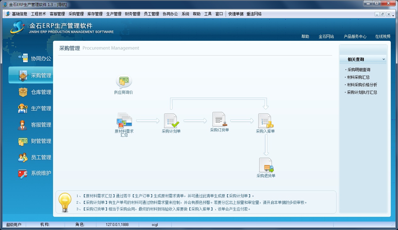 采購管理主要完成從客戶訂單生成原材料需求匯總,到最終簽訂采購合同,驗收入庫的過程。