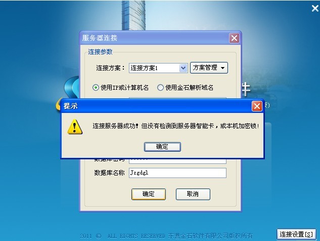 試用版或加密鎖沒(méi)插好,則會(huì)提示連接服務(wù)器成功!但沒(méi)有檢測(cè)到服務(wù)器智能卡,或本機(jī)機(jī)密鎖