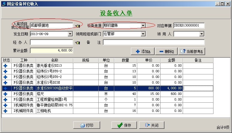 固定設(shè)備、材料庫(kù)存的實(shí)際數(shù)量應(yīng)該通過業(yè)務(wù)單據(jù)來錄入。其中固定設(shè)備通過設(shè)備收入單來錄入期初數(shù)量。如下圖: