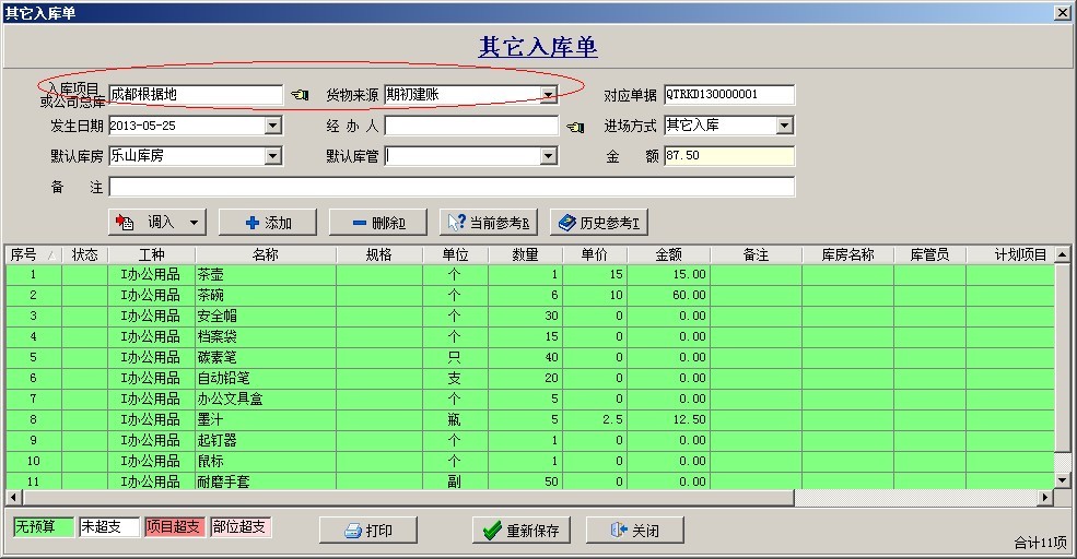 材料庫(kù)存通過其他入庫(kù)單來錄入庫(kù)存數(shù)量。如下圖: