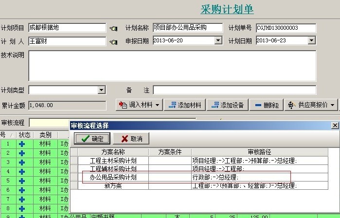 方案設置完成后,用戶在創(chuàng)建單據(jù)的時候根據(jù)不同的情況就可以選擇不同的方案,例如:如果公司行政部要采購辦公用品,那么他們在做采購計劃單的時候,審核方案就可以選擇辦公用品方案。如下圖: