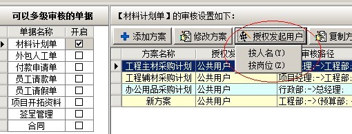 審核流程設置完成后,保存生效,然后再設置授權發(fā)起用戶,在新建審核方案的界面上,選中審核方案,點擊【授權發(fā)起用戶按鈕】。這是會彈出按人名和按崗位兩種模式,按人名授權就是在彈出的窗口中選中需要授權的用戶(其中公共用戶是指的全部用戶),按崗位授權就是在彈出的窗口中選中需要授權的崗位,統(tǒng)一崗位下所有用戶被授權。如下圖: